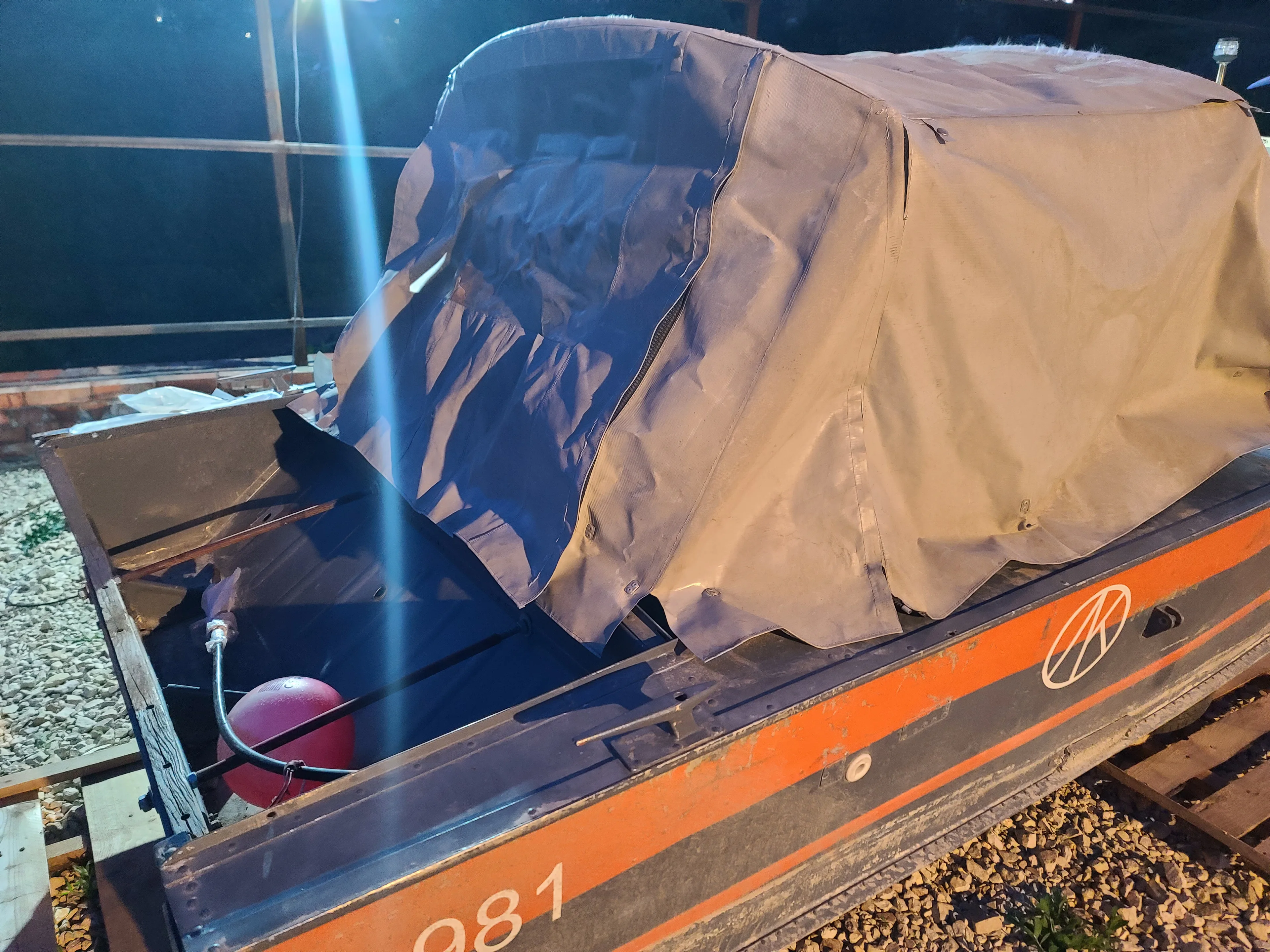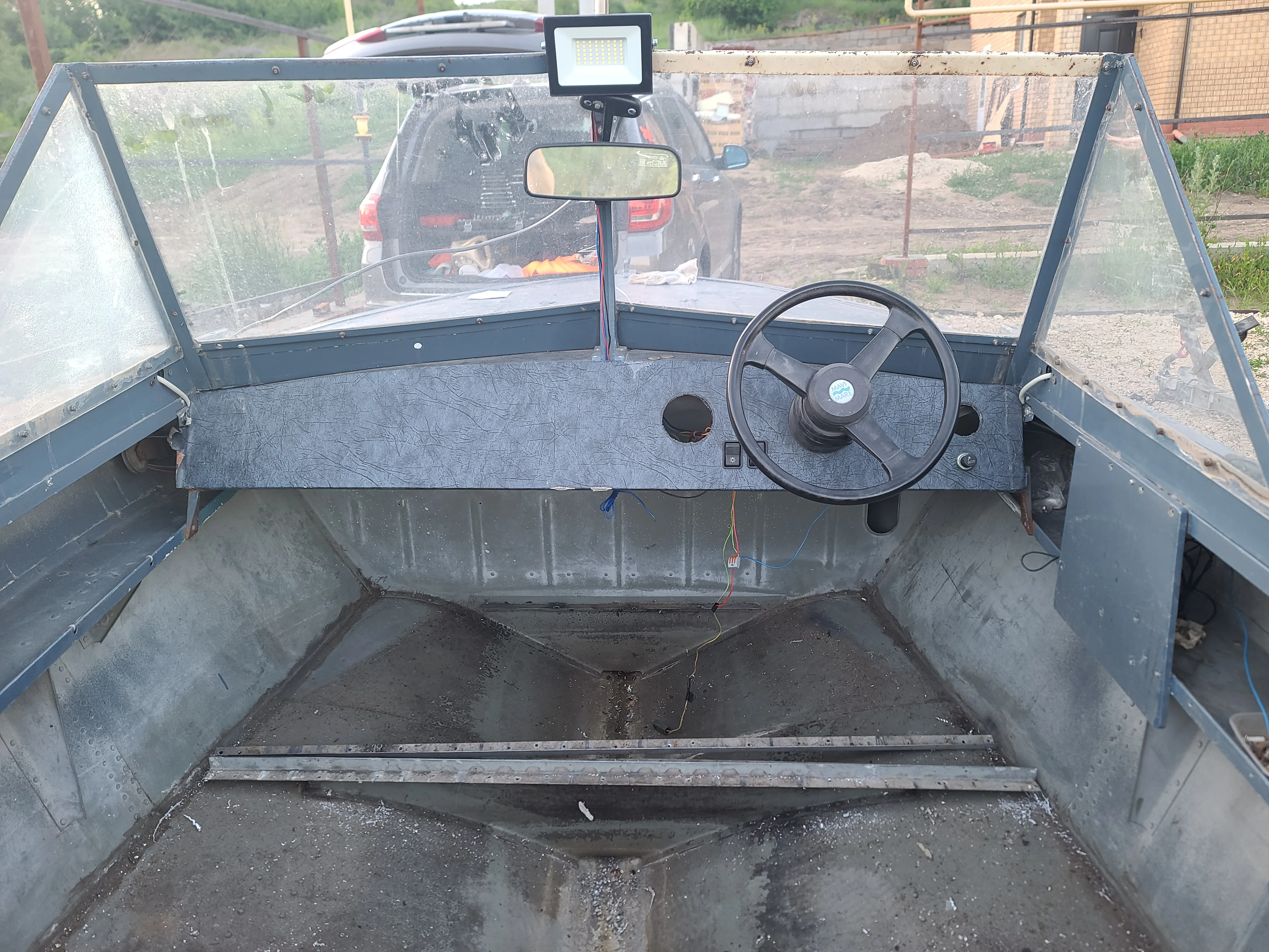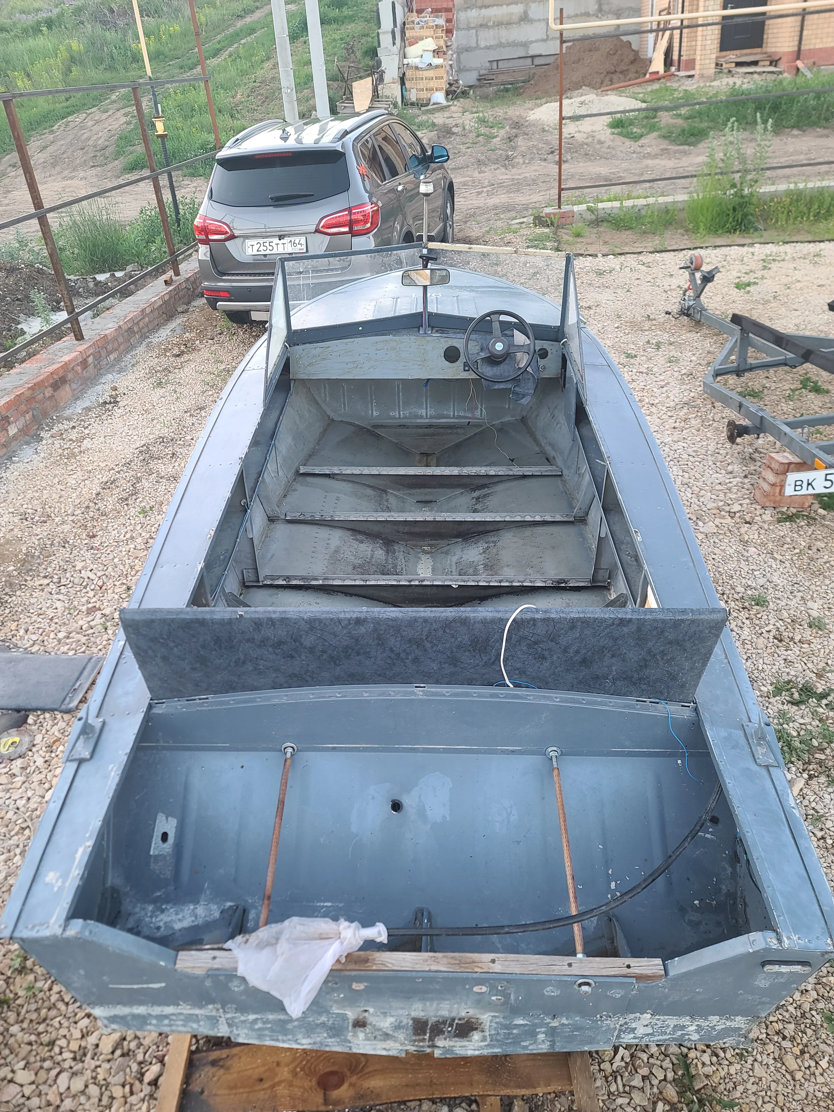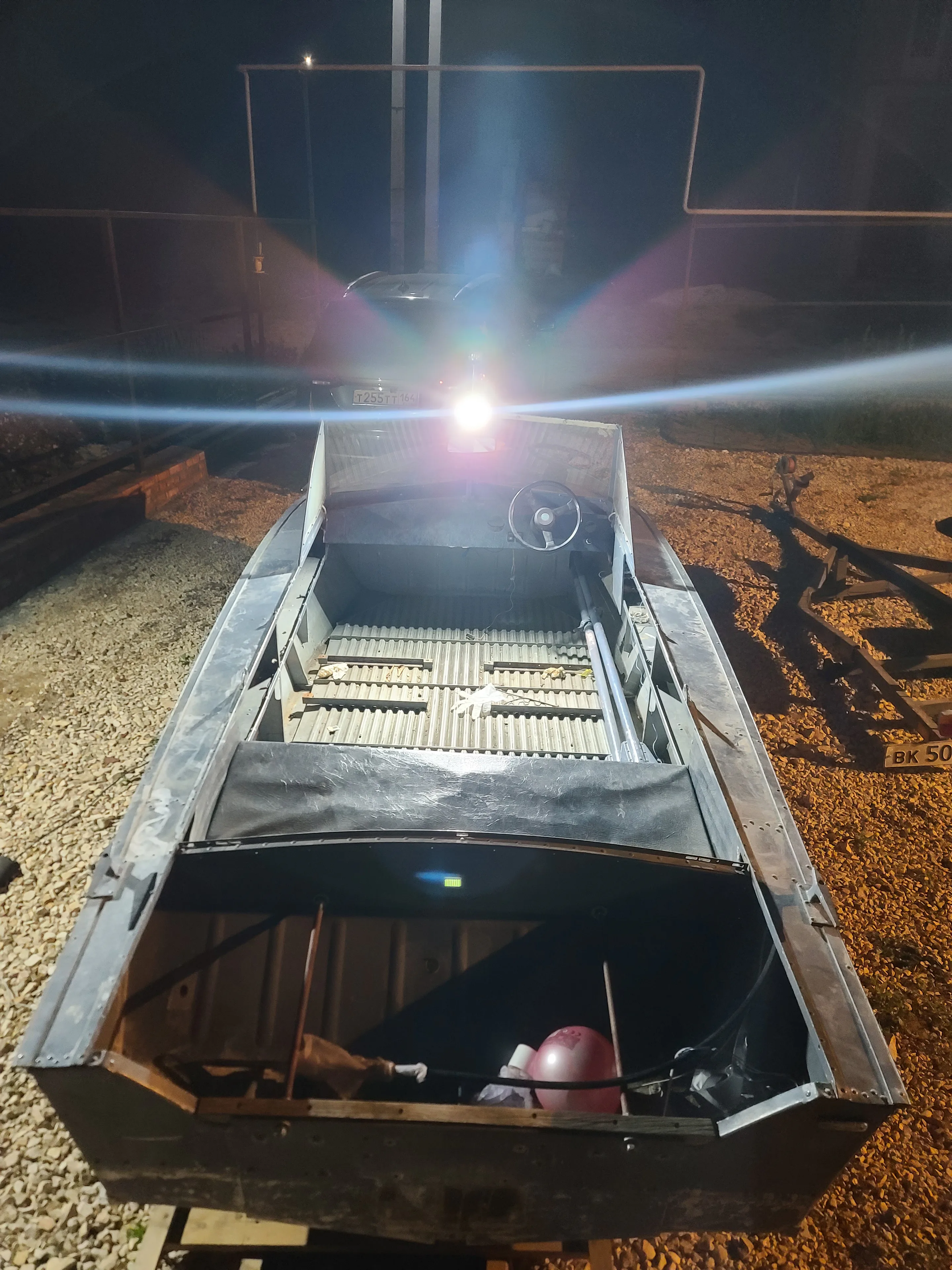 Лодка отпескоструена, загоняем обратно. К сожалению, фоток не делал, потому что надо было как можно скорее укрывать голый алюминий кислотным грунтом, поэтому фото с камеры: