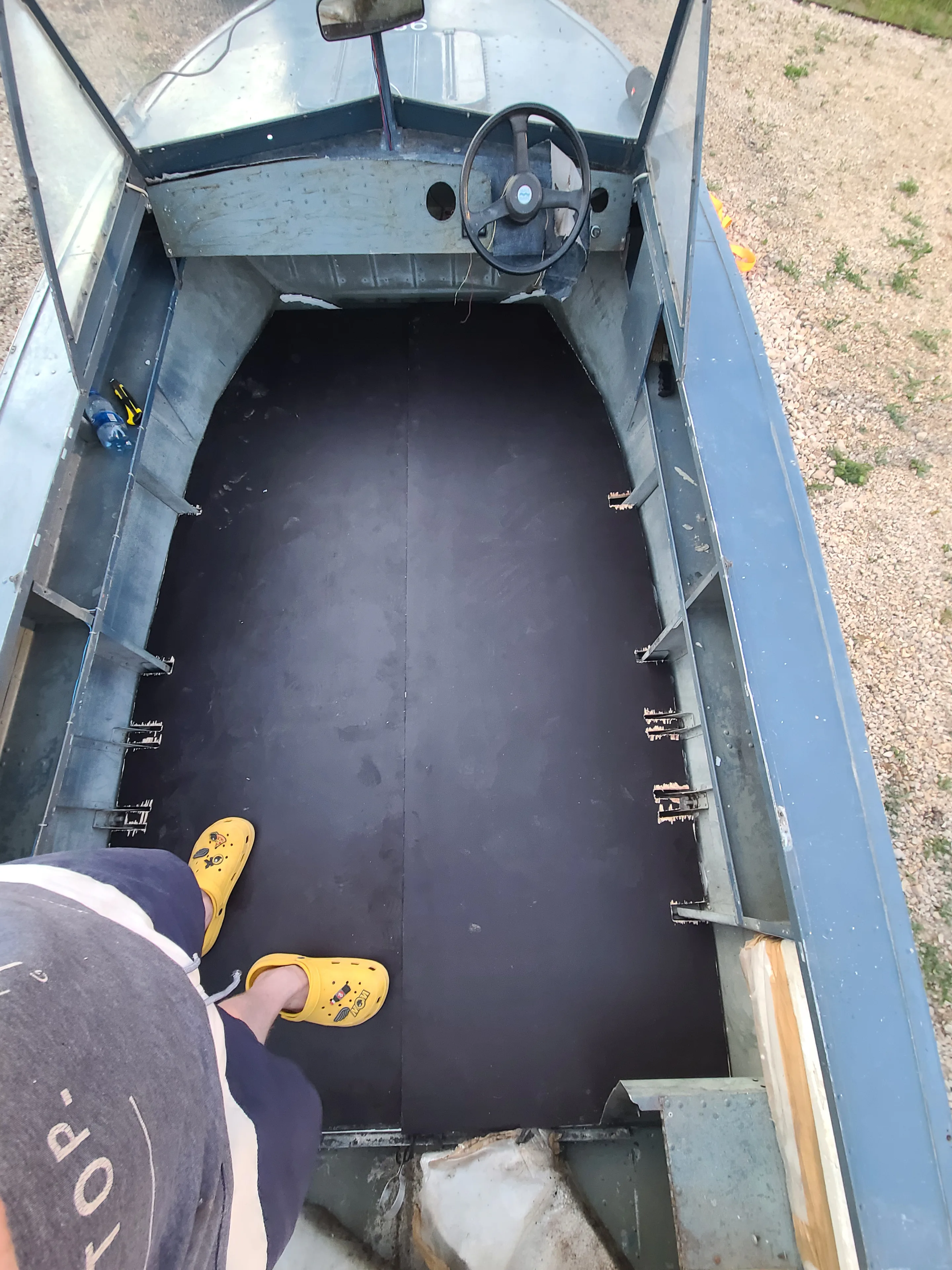 На следующий день снимаю родные полы, сиденья (судя по всему от какого-то японца 90-ых годов, велюровые и даже на рабочих салазках). Сиденья удобные, но низкие и стационарные - а мне принципиально чтобы они были минималистичные, съемные и трансформировались бы в столики , складываясь. Ну и чем выше сидишь - тем лучше видишь проплывающий мусор на воде. Короче - демонтируем!